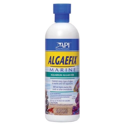 API Algaefix Marine is a reef-safe aquarium algaecide that controls a variety of algae strains in marine and reef aquaria. This powerful and effective solution will not harm marine fish, corals, invertebrates, or coralline algae. Algaefix Marine effectively controls Green Algae, “Red Slime”, and Brown Algae in marine aquariums containing live corals, invertebrates, and fish. Use weekly to control algae growth and reduce tiresome aquarium maintenance. This product does not discolor water or cause foaming. Use as directed.