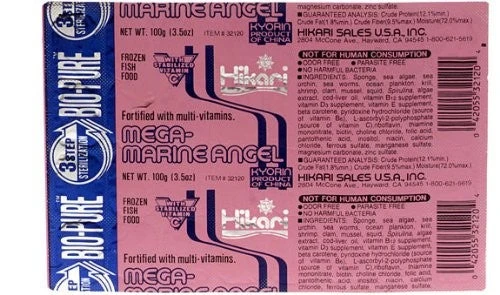 Hikari Bio-Pure Frozen Mega-Marine Angel is developed specially for saltwater angelfish to address the need for sponge in their diet. This product is high in freshwater and helps fish purge salt from their system, and digest their food more completely and with less energy. As a result, your fishy friends will grow faster and be more vibrant in color. Fortified with multi-vitamins, Mega-Marine Angel provides maximum nutrition for your fish. In addition, it is sterilized in three steps to ensure it is free of harmful bacteria, parasites, and foul odors.
